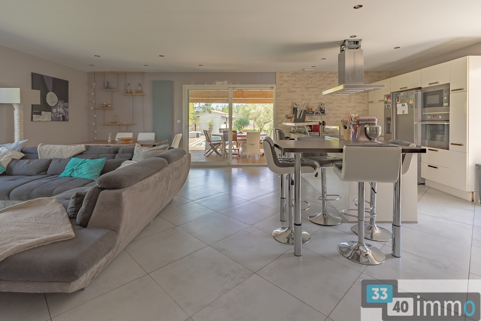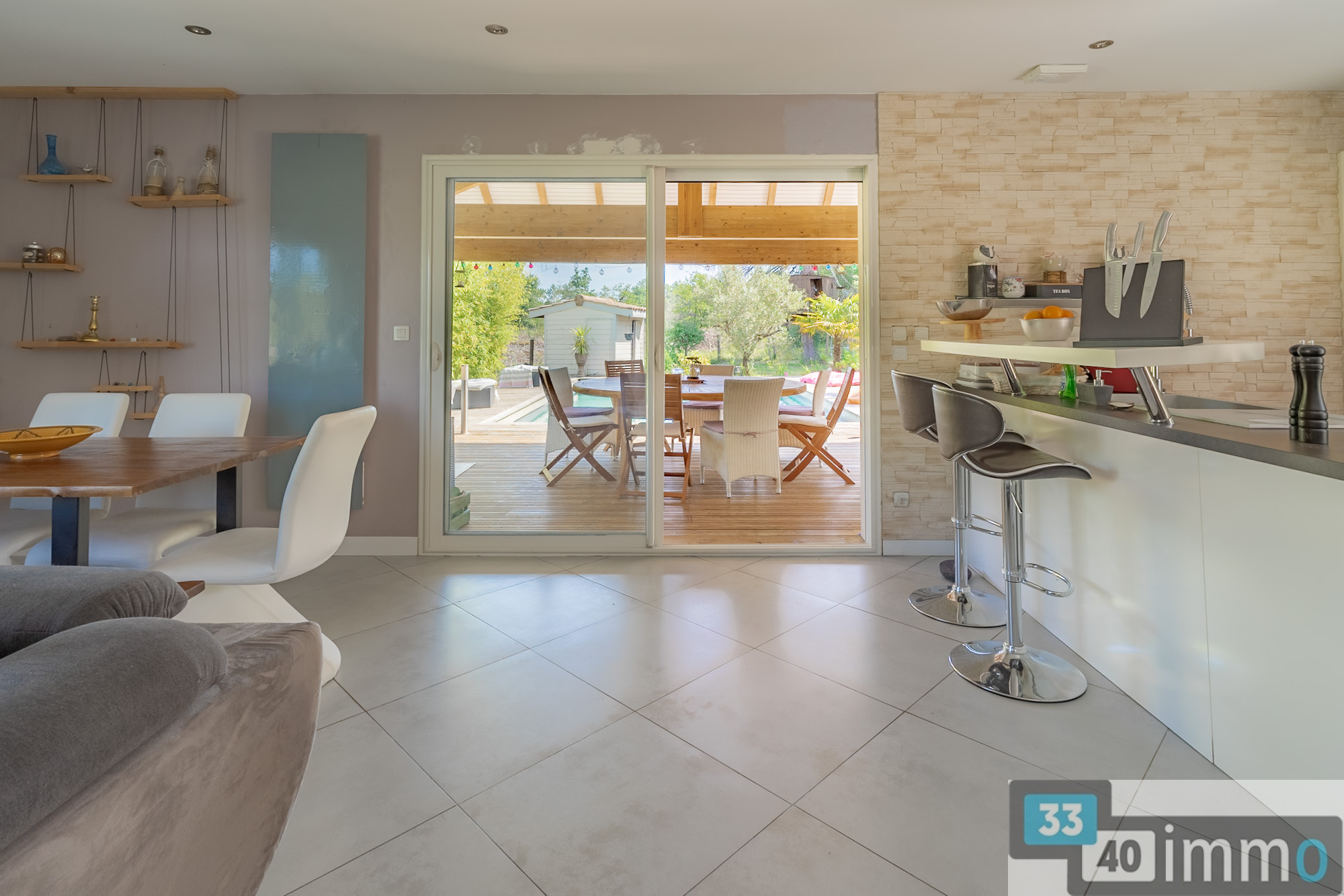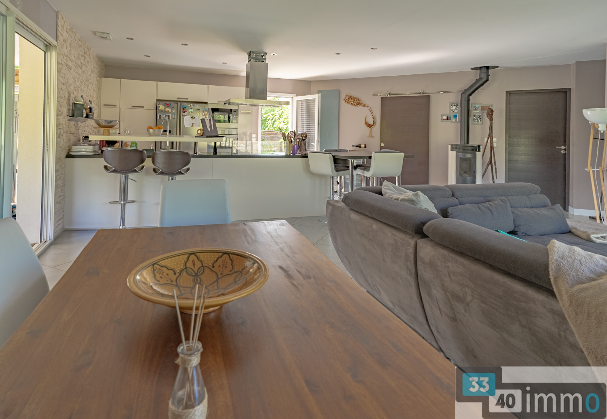 L'entrée est clairement délimitée et dispose de rangements intégrés. Elle ouvre sur une pièce de vie de 52 m², largement vitrée et exposée plein sud. La cuisine aménagée est ouverte sur l'espace salon et salle à manger, offrant une organisation fluide et fonctionnelle. Un poêle à granulés équipe la pièce pour la saison hivernale. En continuité, une grande terrasse couverte prolonge naturellement l'espace de vie vers l'extérieur et la piscine. La maison développe trois chambres, dont une suite parentale avec dressing et salle d'eau. Une salle de bain indépendante complète l'espace nuit, avec baignoire de grande dimension et double vasque. Les peintures ont été récemment refaites dans des tons clairs, apportant luminosité et cohérence à l'ensemble. Les chambres d'enfants sont équipées d'un parquet posé en chevron. La cuisine bénéficie également d'un accès extérieur direct vers une terrasse bois qui fait le tour de la maison, renforçant la relation entre intérieur et extérieur. L'architecture est résolument contemporaine. Le terrain, paysagé, offre une vue dégagée sur la parcelle et la forêt. L'environnement garantit l'absence de vis-à-vis et une réelle tranquillité. Une dépendance entièrement aménagée de 36m2 permet d'accueillir famille ou amis, ou de créer un espace indépendant. Elle comprend une salle d'eau, des toilettes, un espace de vie et une chambre en mezzanine. Un abri vélos en bois de grande capacité complète les annexes. L'assainissement individuel est conforme. Les écoles maternelle et primaire sont accessibles à pied en quelques minutes. Salles est une commune dynamique du Val de l'Eyre, appréciée pour son cadre de vie entre forêt et bassin. Sa situation permet un accès fluide vers Bordeaux et le Bassin d'Arcachon.