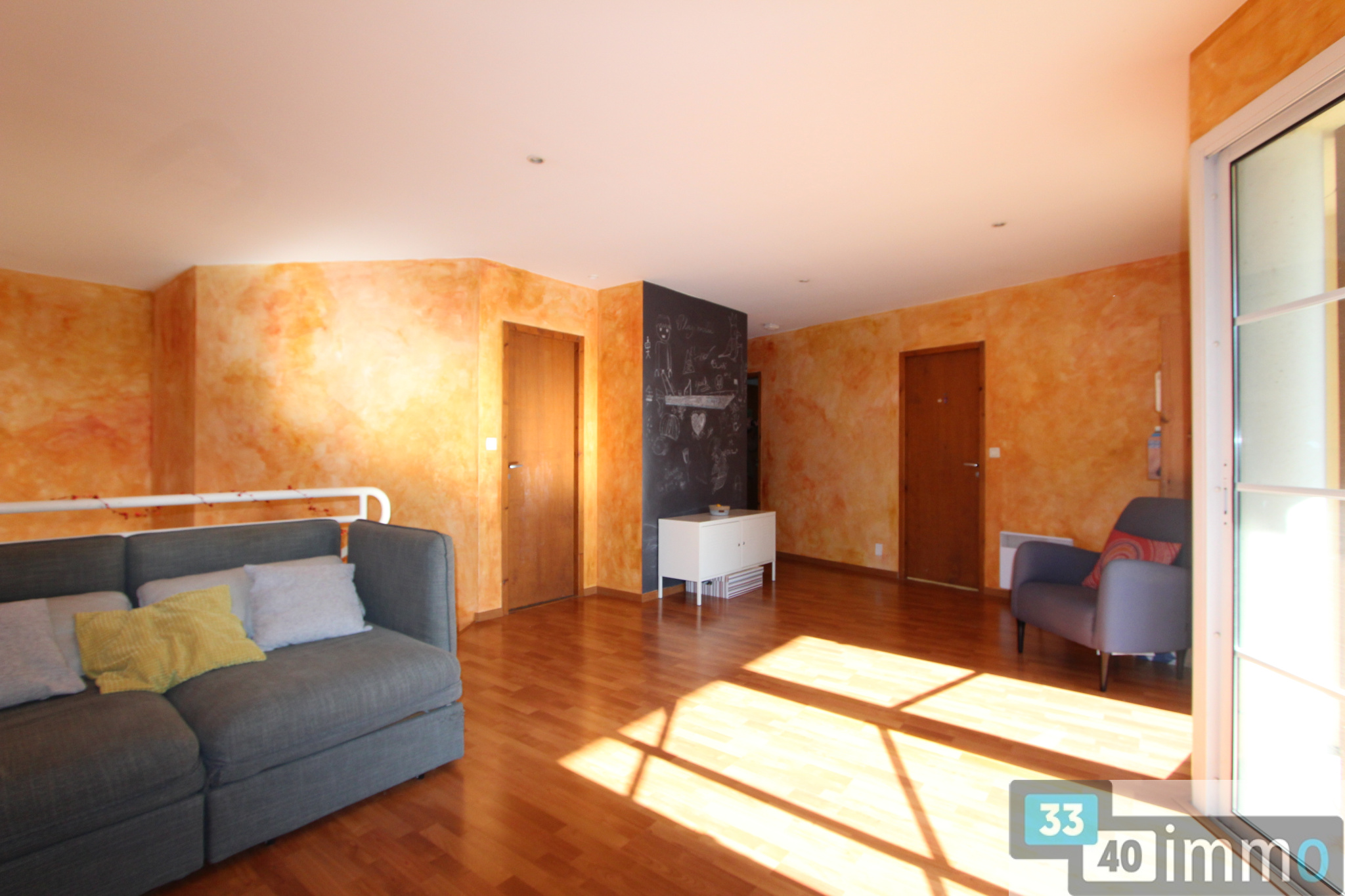 Le vaste salon-séjour, baigné de soleil grâce à ses larges ouvertures, s’ouvre sur une cuisine moderne, aménagée et entièrement équipée, complétée par un cellier attenant.