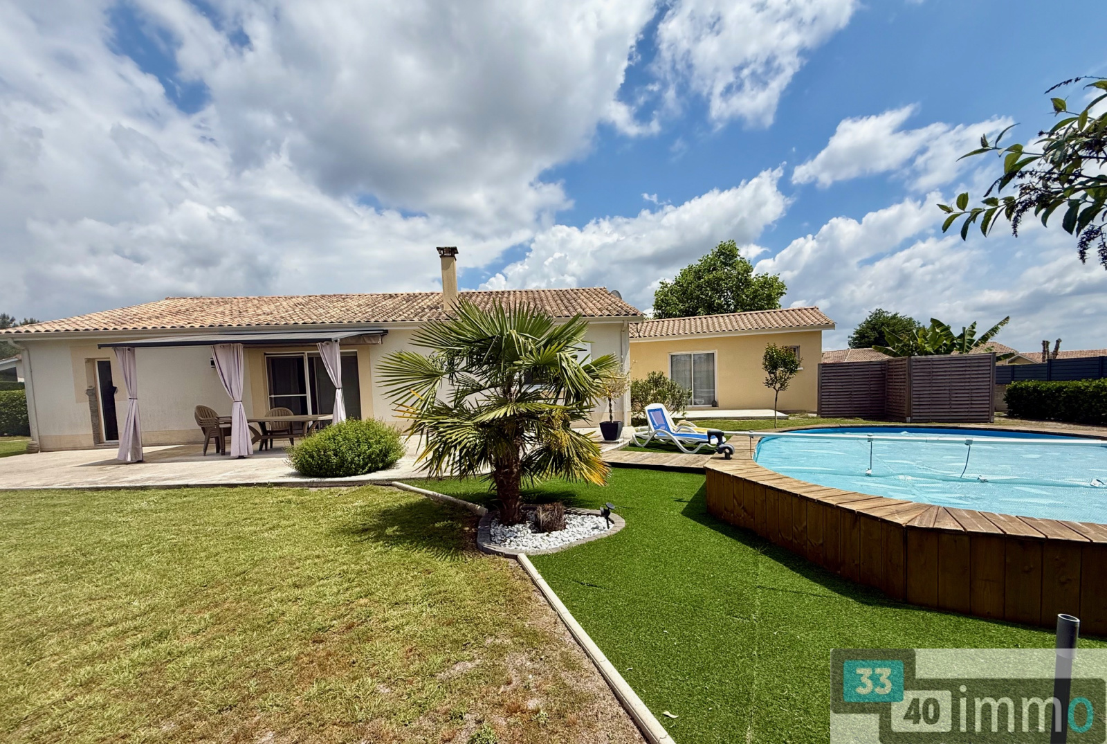 A l'extérieur, une terrasse, une piscine hors sol, un cabanon de 20 m2, 3 puits avec 6 points d'eau, portail éléctrique, visiophone, le tout sur un beau terrain clos et arboré de 1215 m2.